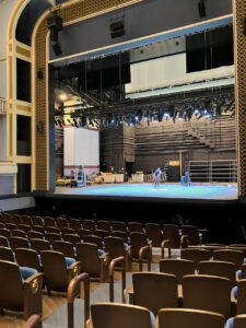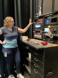 Speaking of working together, stage managing is its own fine craft that is highly choreographed and organized, and it starts when the theater is being designed and built. Ms. Mullins showed us how each room backstage (the wardrobe office, the principal’s dressing room, the ensemble dressing rooms, and the cast members check-in lobby) all have intercom speakers and monitors showing stage actions. When the stage manager needs an actor to move to upstage left, or when she needs the ensemble in the group dressing room to quiet down their chitchatting during a tender moment on stage, she has the ability to page each room, while wearing headphones and monitoring screens with a multitude of switches that link to all the rooms. “It’s all about communication”, says Ms. Mullins.
