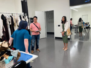 Ms. Dolney stressed the importance of working together with other departments, such as lighting designers, after learning from an incident where she designed beautiful green costumes, but colors of lighting turned them to ugly brown on stage. She also works together with the Wigs and Makeup department, and they decide the order of how an actor gets dressed – male roles usually have clothing that buttons up in the front, while female roles typically get dresses that zip up in the back. Even this difference can affect whether the wig gets put on before or after the costumes.